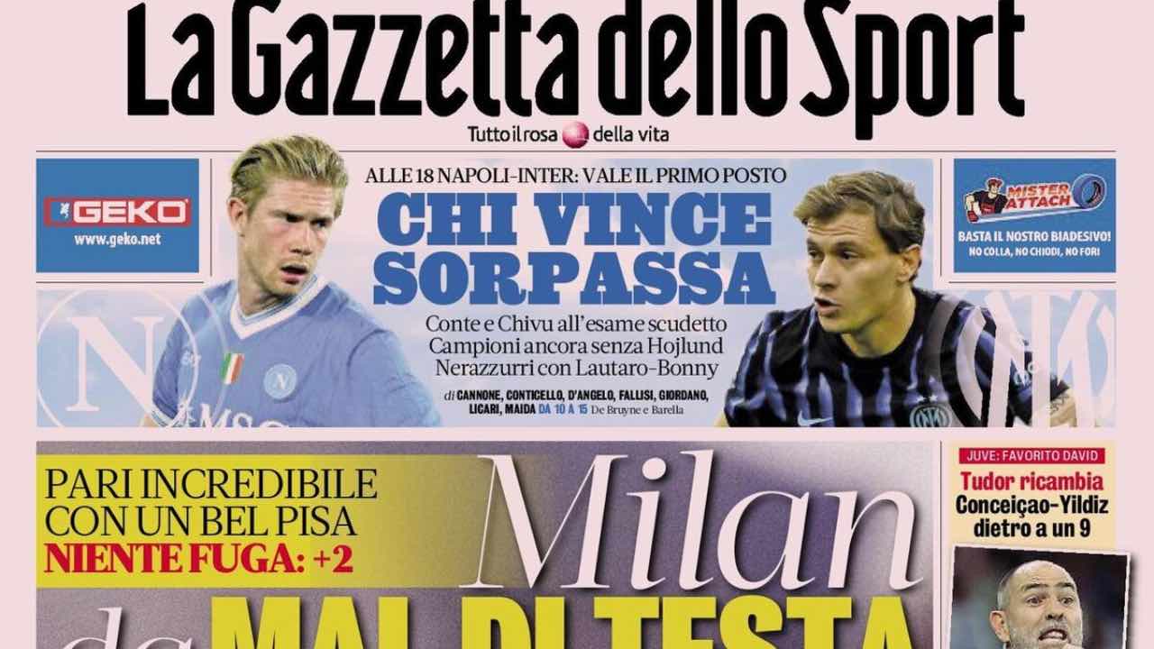 La Gazzetta dello Sport parte dal pareggio per 2-2 tra Milan e Pisa, acciuffato dai rossoneri con Athekame nel recupero. Spazio anche al big match tra Napoli e Inter, che hanno la possibilità di portarsi in vetta alla classifica.