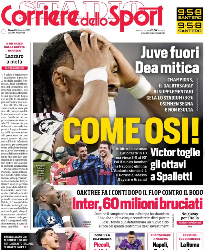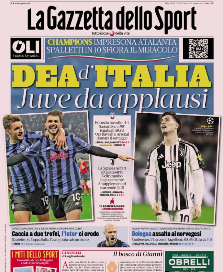 La Gazzetta dello Sport parla delle partite di Atalanta e Juventus in Champions League, con in basso spazio all’Inter e al Bologna.