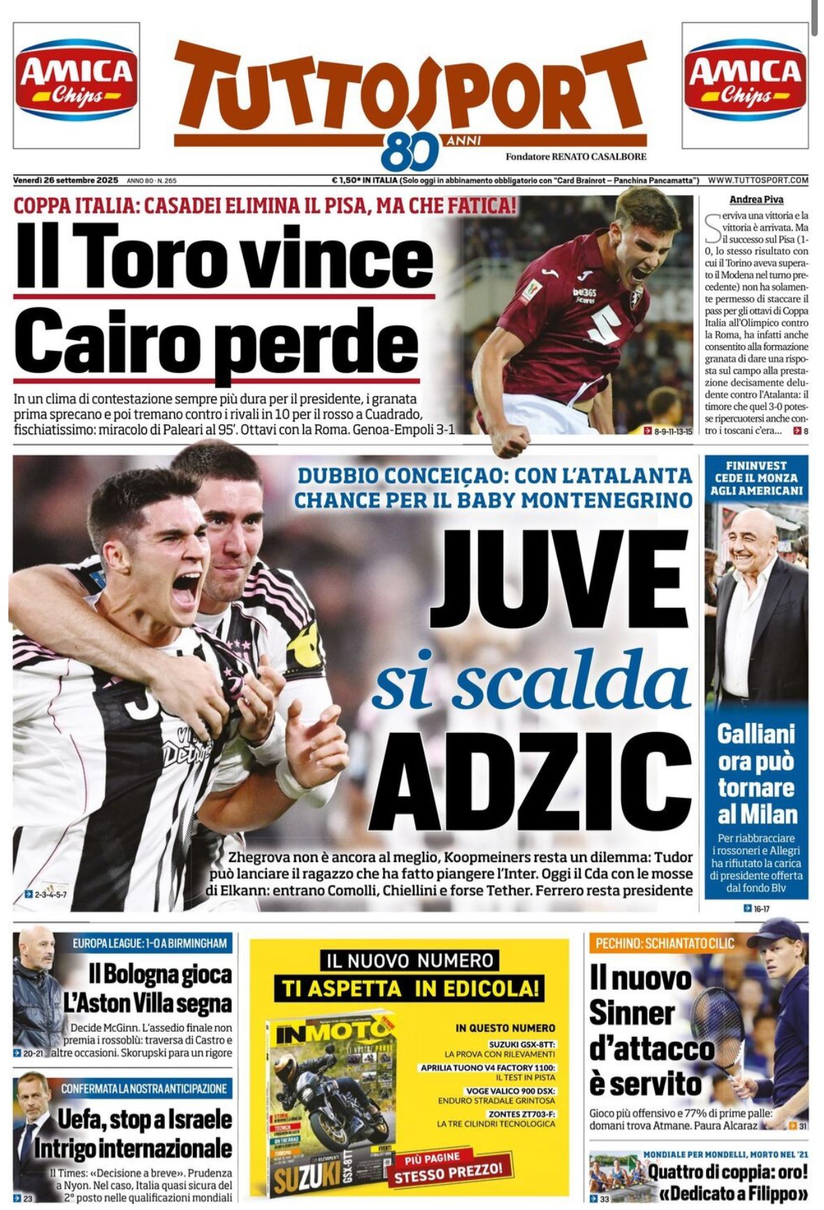 “Juve si scalda Adzic”: apre così Tuttosport. Taglio alto, invece, dedicato alla vittoria del Torino in Coppa Italia e alla contestazione a Cairo: “Il Toro vince, Cairo perde”
