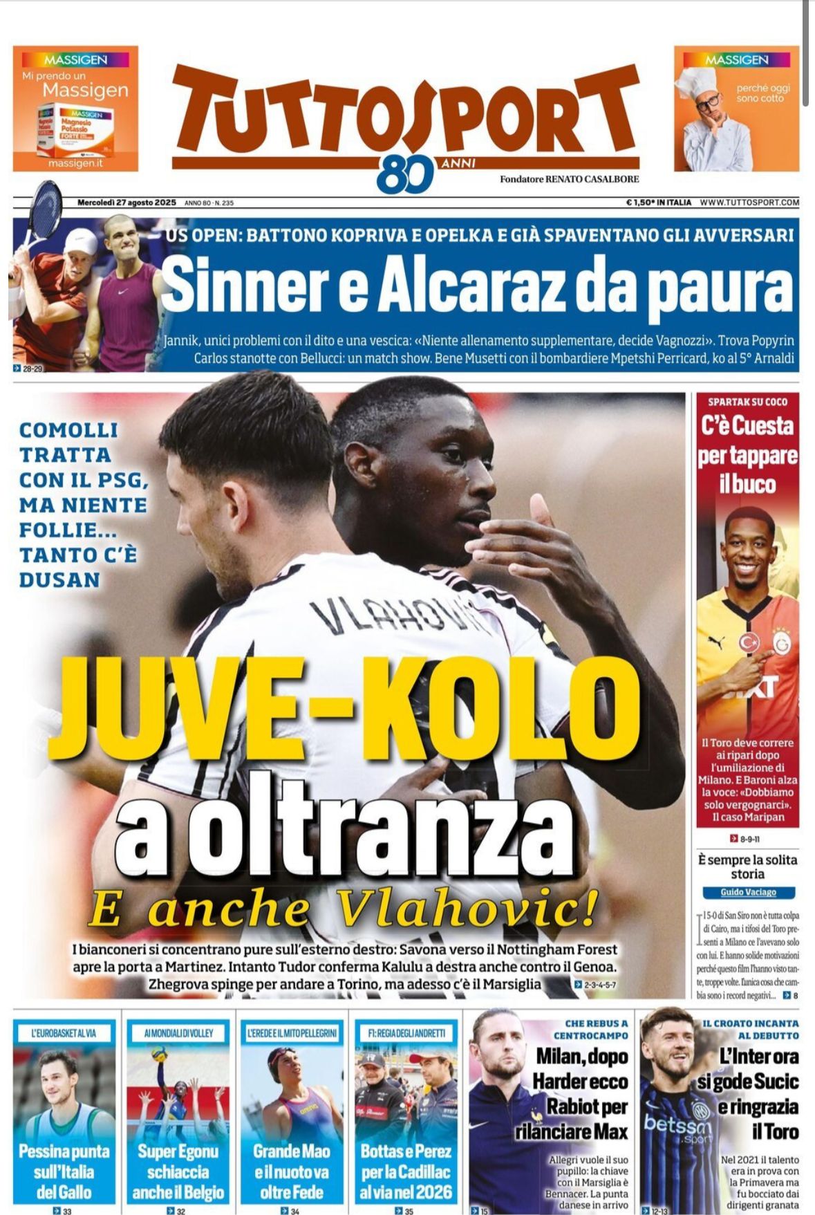 Tuttospost apre con: “Juve-Kolo, a oltranza e anche Vlahovic”. Taglio alto dedicato al tennis con: “Sinner e Alcaraz da paura”