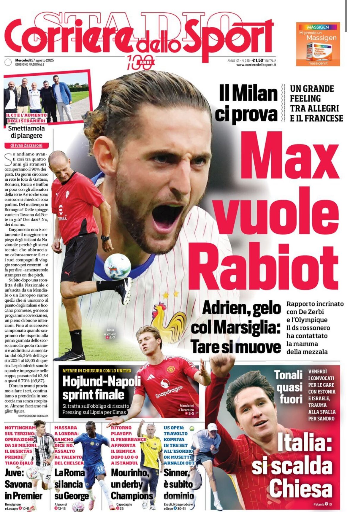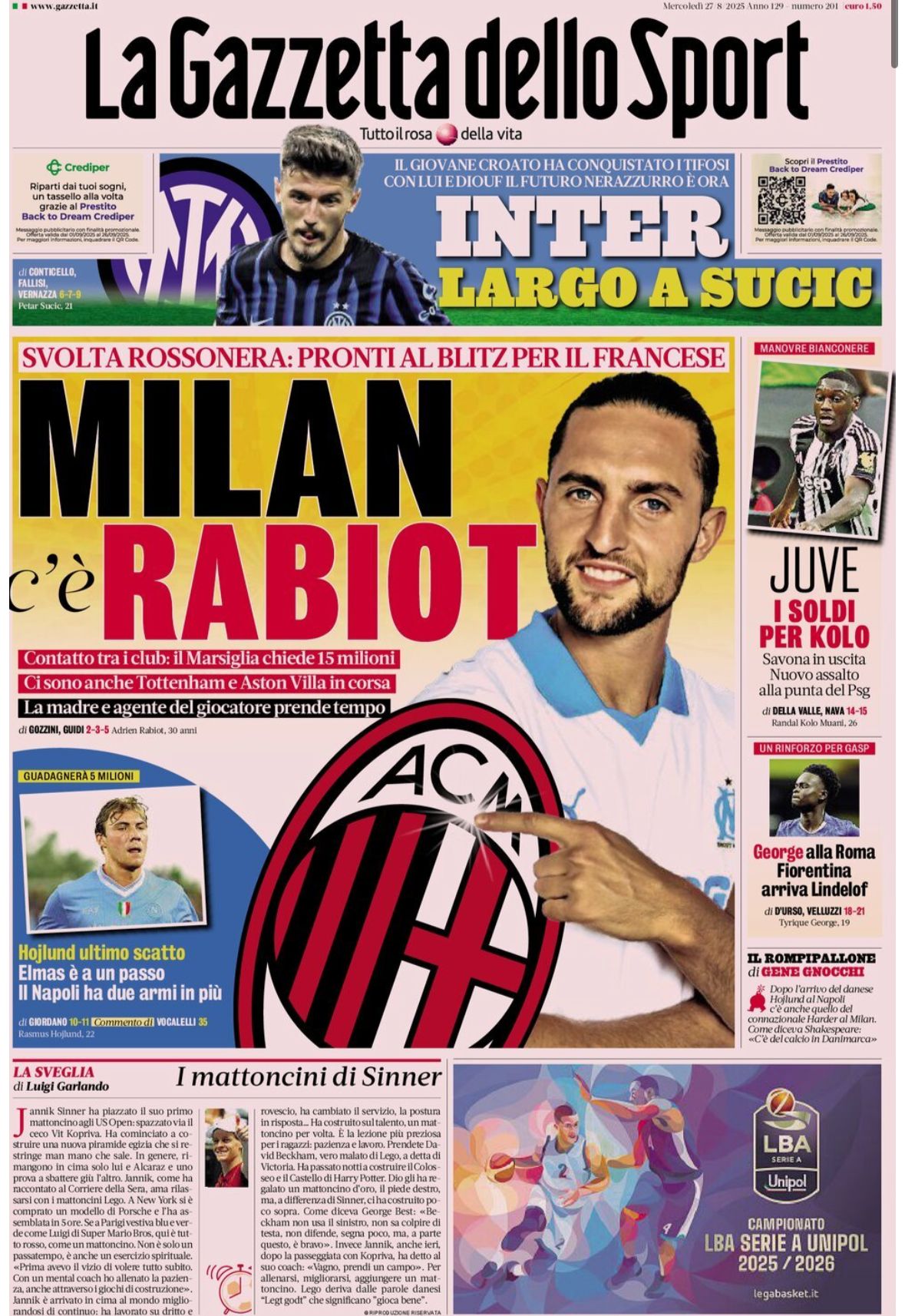 La Gazzetta dello Sport apre con Rabiot-Milan titolando: “Milan c’è Rabiot. Taglio alto dedicato all’Inter e a Sucic con: “Inter, largo a Sucic”.