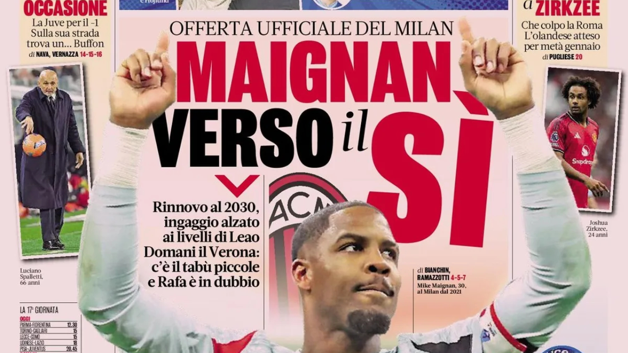 La Gazzetta dello Sport apre con il possibile rinnovo di Maignan con il Milan. Spazio anche al calciomercato della Roma, con il probabile arrivo di Joshua Zirkzee alla corte di Gasperini.
