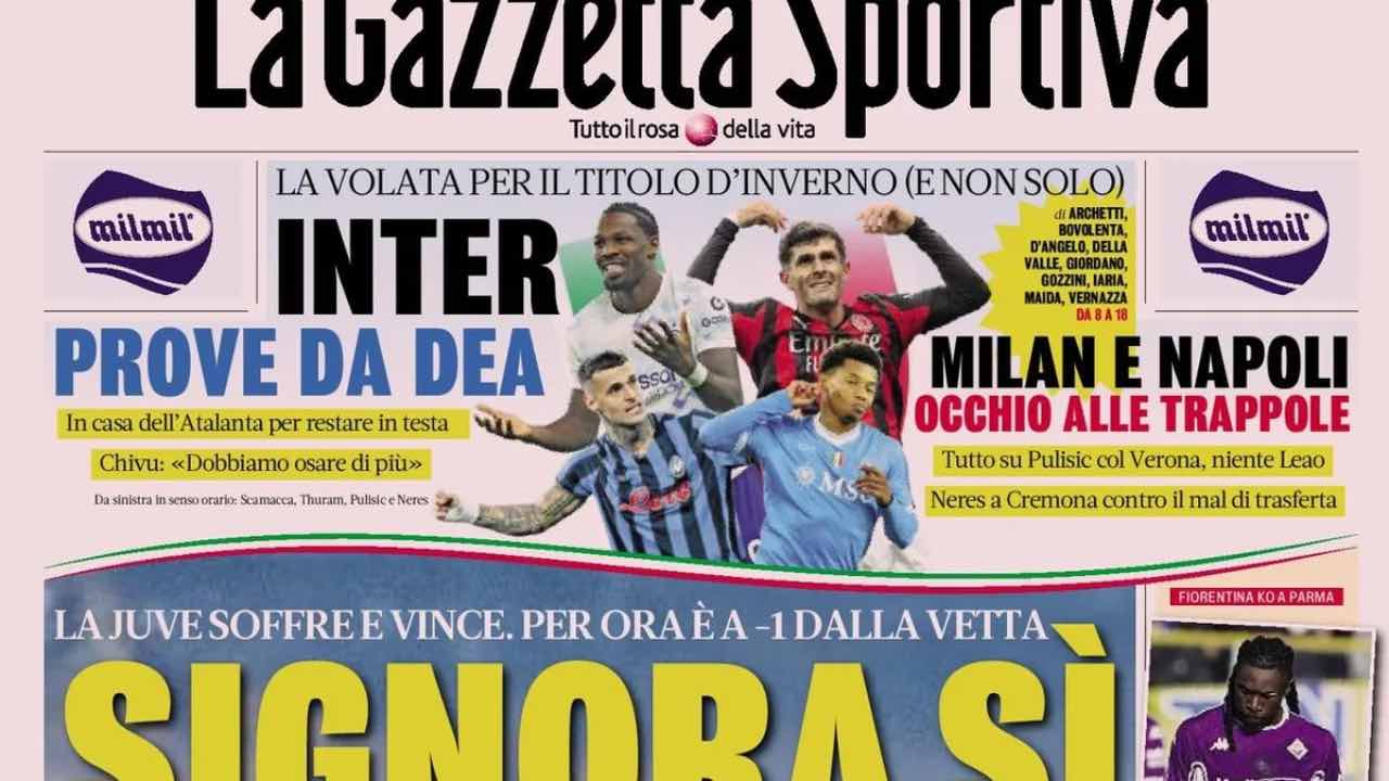 La Gazzetta dello Sport apre con la vittoria esterna della Juventus a Pisa, che avvicina i bianconeri alla vetta in attesa delle altre gare. Spazio anche alla Fiorentina, che dopo il primo successo con l’Udinese è uscita sconfitta con il Parma.