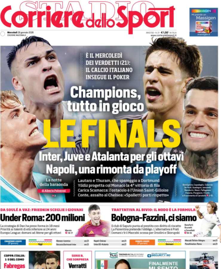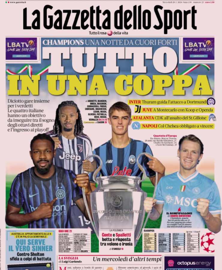 La Gazzetta dello Sport apre puntando sulla serata di Champions League, che vedrà tutte le squadre impegnate in contemporanea.