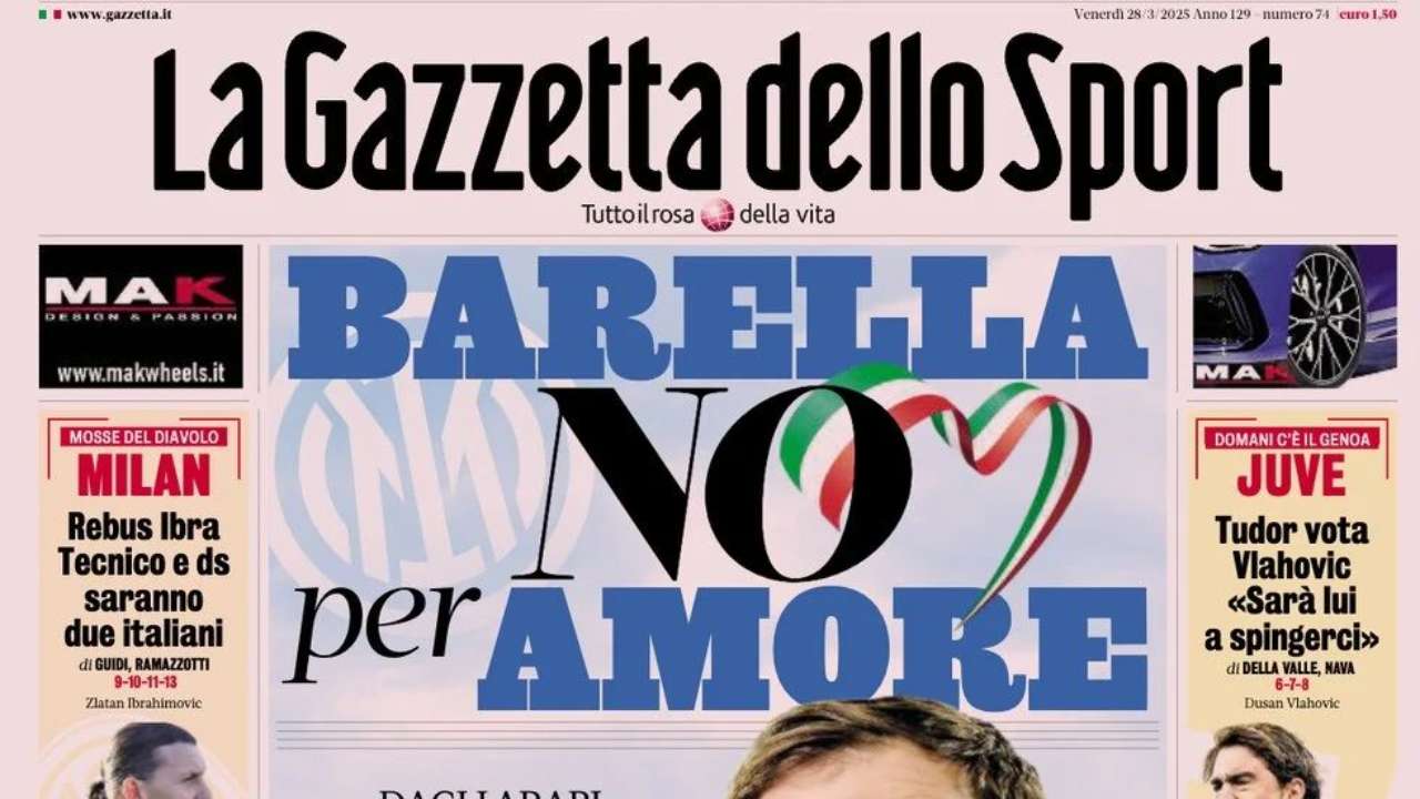 La Gazzetta dello Sport apre con l’Inter e Nicolò Barella, mentre sui lati trovano spazio Milan e Juventus.