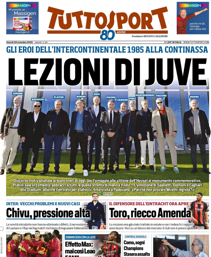 Tuttosport parla della visita dei campioni della Coppa Intercontinentale 1985 alla Juventus, mentre in basso spazio a Inter e Torino.