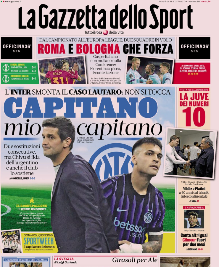 La gallery delle prime pagine dei principali quotidiani sportivi italiani in edicola oggi, venerdì 28 novembre 2025