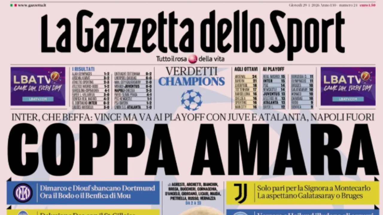 La Gazzetta dello Sport apre con un bilancio sulla serata di Champions League, amara per le italiane: solo playoff per Inter, Juventus e Atalanta, mentre il Napoli è eliminato.