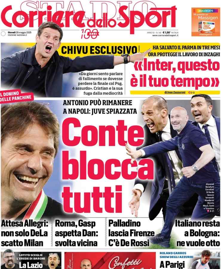 “Conte blocca tutti”, invece, l’apertura de Il Corriere dello Sport in riferimento al giro di panchine. In alto, l’anteprima di un’intervista a Cristian Chivu, allenatore del Parma.