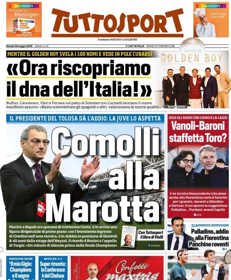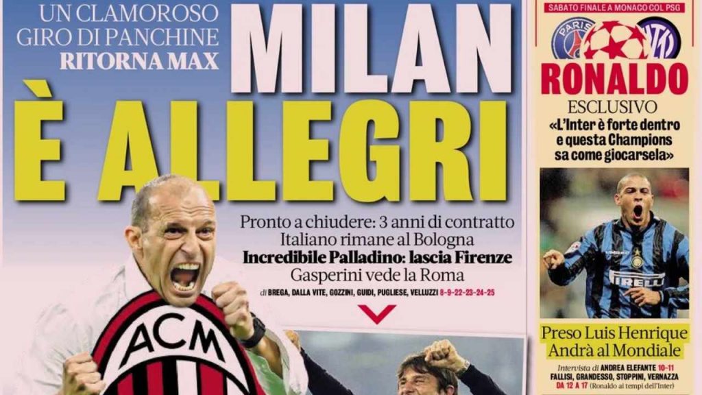La Gazzetta dello Sport titola in apertura “Max è Allegri” trattando il tema del giro di panchine in Serie A. Possibile rinnovo di Italiano al Bologna, le dimissioni di Palladino dalla Fiorentina e l’orizzonte Roma per Gasperini le altre notizie in copertina. A destra un’intervista a Ronaldo il Fenomeno in vista della finale di Champions League tra Paris Saint-Germain e Inter.