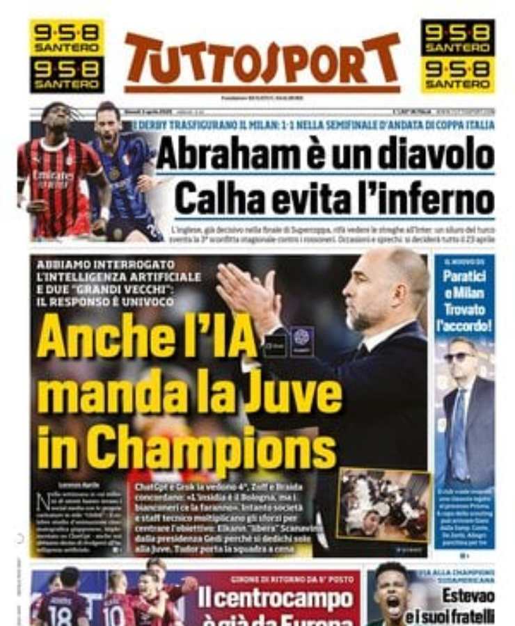 Prime Pagine: “Derby infinito”; “Anche l’IA manda la Juve in Champions”