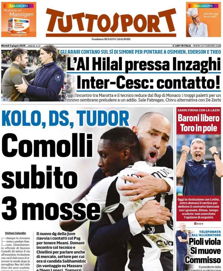 Tuttosport concentra il centro della prima pagina sulle prime tre mosse di Damien Comolli da nuovo direttore generale della Juventus. In alto il pressing dell’Al Hilal su Simone Inzaghi e il contatto tra l’Inter e Cesc Fabregas. A destra, Marco Baroni in pole per la panchina del Torino dopo la separazione dalla Lazio e Stefano Pioli candidato per quella della Fiorentina.