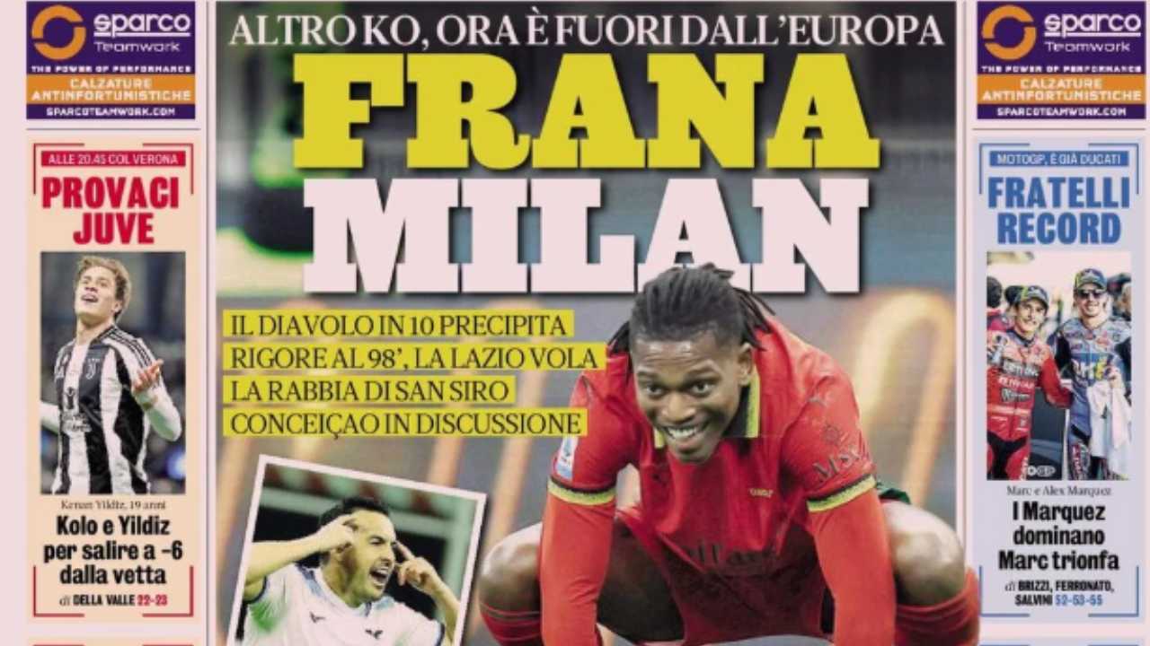 La Gazzetta dello Sport apre dedicandosi alla crisi del Milan, che ha perso anche contro la Lazio. In basso invece il focus è sulla campagna europea dell’Inter, mentre sulla sinistra si parla di Juventus e Torino.