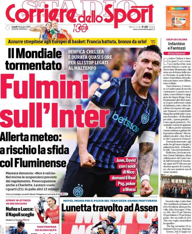 “Fulmini sull’Inter”, invece, è il titolo scelto dal Corriere dello Sport. Nel mirino l’allerta meteo continua che persiste sugli USA e, dopo aver fatto durare Chelsea-Benfica quasi 5 ore, sembra poter mettere a rischio anche la sfida dei nerazzurri con il Fluminense. Poi spazio al mercato del Napoli tra Nunez e Lucca e il bronzo guadagnato dalla Nazionale femminile di basket agli Europei.