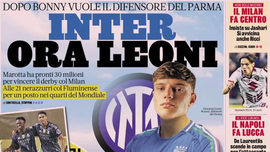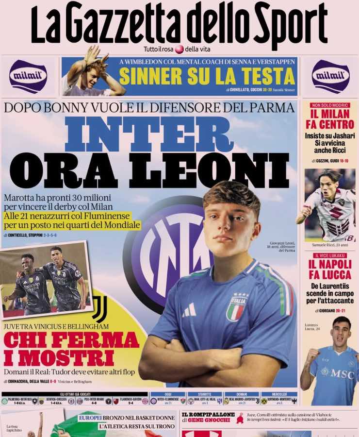 La Gazzetta dello Sport si concentra sull’interesse dell’Inter per Leoni. Spazio poi anche all’avvicinamento di Juve-Real, alla trattativa Ricci-Milan, a quella Lucca-Napoli e a Jannik Sinner, che si prepara per Wimbledon con mental coach e fisioterapista nuovi.