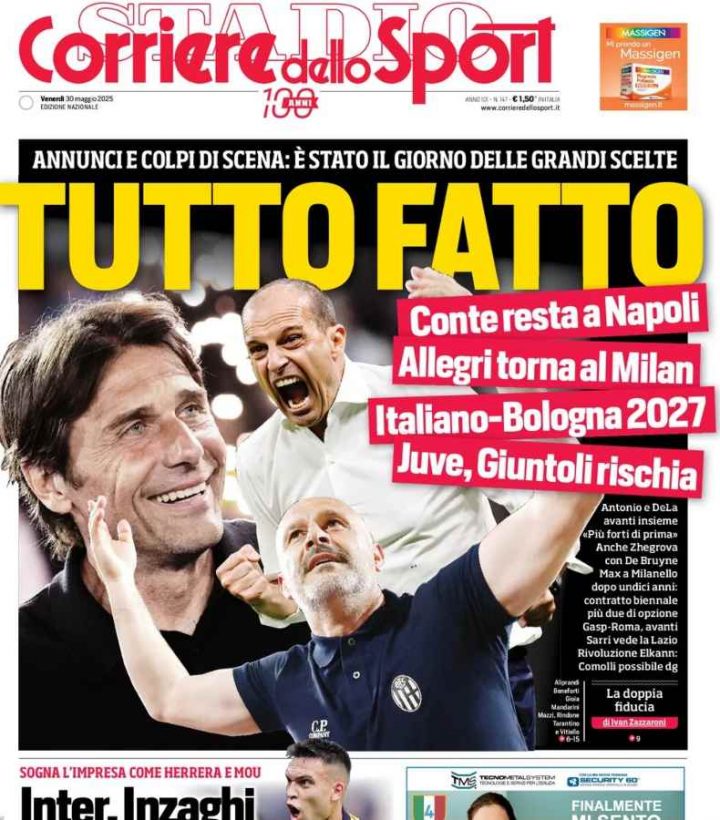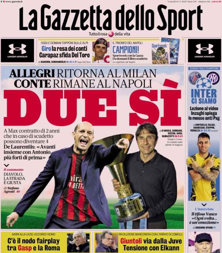 La Gazzetta dello Sport apre con le due grandi novità della giornata di giovedì 29 maggio ovvero le panchine di Milan e Napoli. Massimiliano Allegri ha firmato con i rossoneri, mentre Antonio Conte resterà sulla panchina del Napoli anche nella prossima stagione.