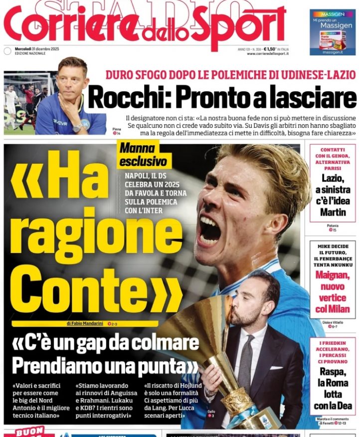 Il Corriere dello Sport apre con un’intervista esclusiva al d.s. del Napoli Giovanni Manna. Si parla anche di arbitri e delle parole del designatore Gianluca Rocchi dopo l’ultima giornata. Spazio anche al mercato di Lazio, Milan e Roma.