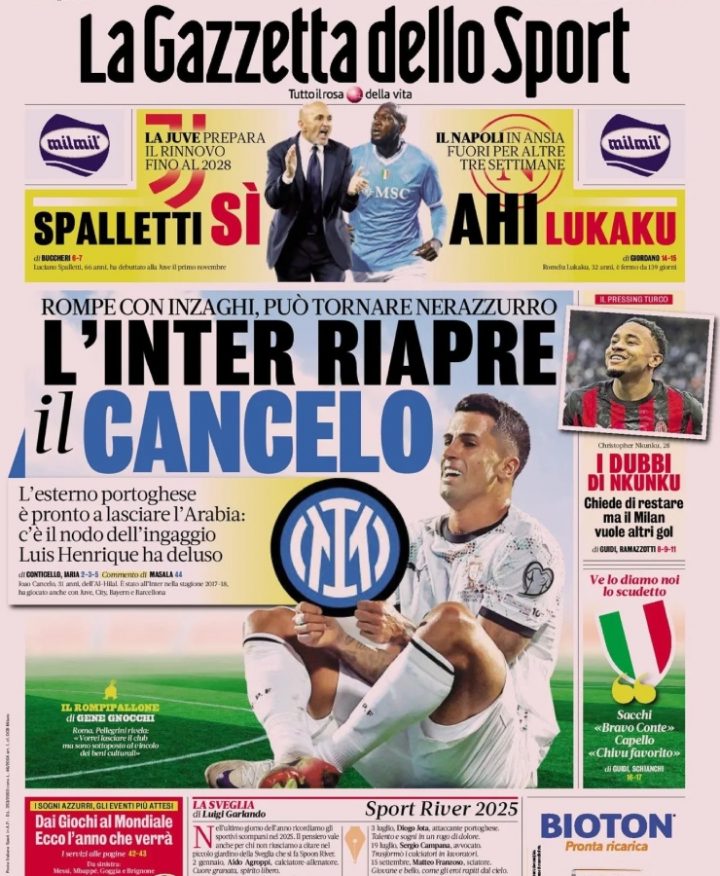 La Gazzetta dello Sport dedica ampio spazio in prima pagina a Joao Cancelo, pronto a salutare l’Al-Hilal e che sarebbe un obiettivo dell’Inter per gennaio. Spazio anche alla Juventus, che preparerebbe un rinnovo fino al 2028 per Spalletti, al Napoli, che rischia di perdere Lukaku per altre tre settimane, e al Milan, con un focus sul momento di Nkunku tra mercato e campo.