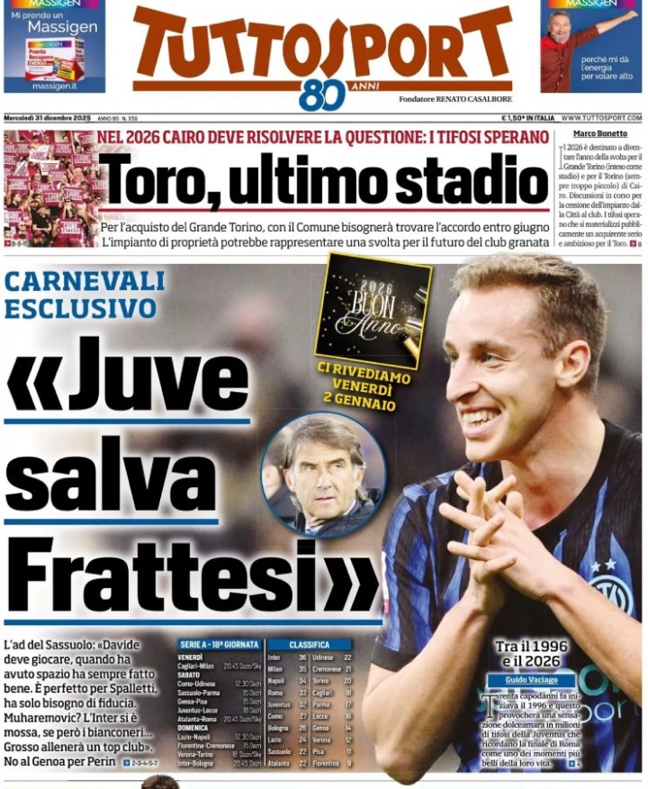 Le prime pagine dei principali quotidiani sportivi in edicola oggi, mercoledì 31 dicembre 2025.