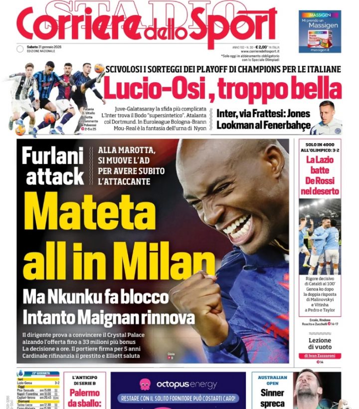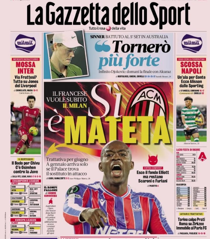 La Gazzetta dello Sport dedica ampio spazio in prima pagina alla trattativa tra Milan e Crystal Palace per Mateta. Focus anche sulle trattative dell’Inter per Curtis Jones e del Napoli per Alisson Santos, oltre ai sorteggi di Champions ed Europa League e all’anticipo di campionato tra Lazio e Genoa.