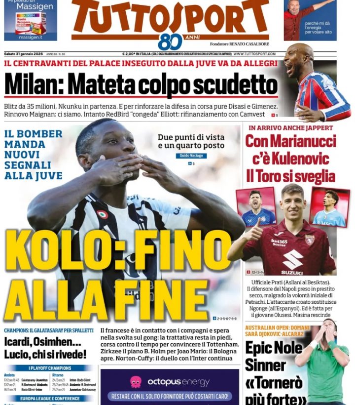 Tuttosport si concentra sull’obiettivo per l’attacco della Juve, che resta sempre Kolo Muani. Poi il mercato di Torino e Milan, i sorteggi europei e anche il tennis, con la vittoria di Novak Djokovic su Jannik Sinner.