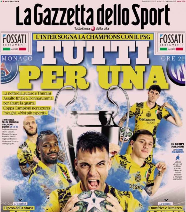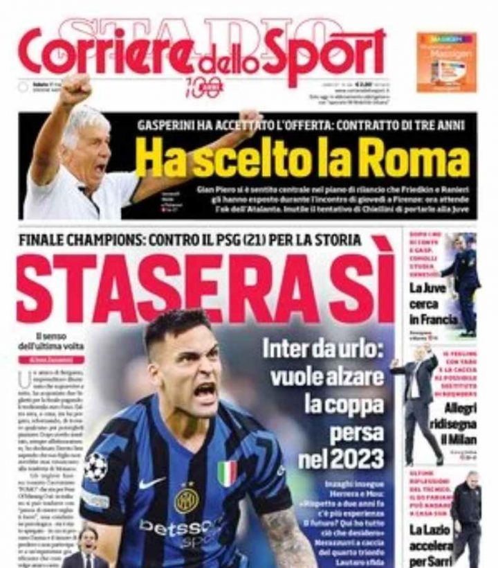 La Gazzetta dello Sport non può che aprire con la finale di UEFA Champions League tra Paris Saint-Germain e Inter. I parigini per alzare la loro prima coppa dalle grandi orecchie della loro storia e completare il triplete, l’Inter per aggiungere in bacheca la quarta.