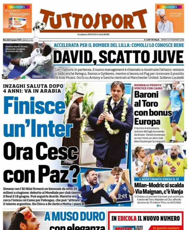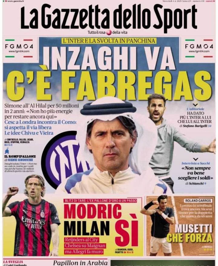 La Gazzetta dello Sport si concentra sull’addio di Simone Inzaghi all’Inter e sui possibili sostituti sulla panchina nerazzurra. Spazio anche sul mercato del Milan: si aspetta Luka ModricIl Corriere dello Sport apre sull’addio di Simone Inzaghi all’Inter e sul possibile successore Cesc Fabregas. Spazio anche al mercato di Juventus, Napoli, Milan, Roma e FiorentinaTuttosport si concentra sul mercato della Juve e sull’accelerata per David. Spazio anche ai saluti di Simone Inzaghi all’Inter e al mercato di Torino e Milan