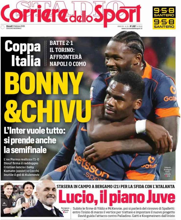 Anche il Corriere dello Sport si concentra sulle due sfide di Coppa Italia: la vittoria dei nerazzurri contro il Torino e la gara della Juventus a Bergamo.