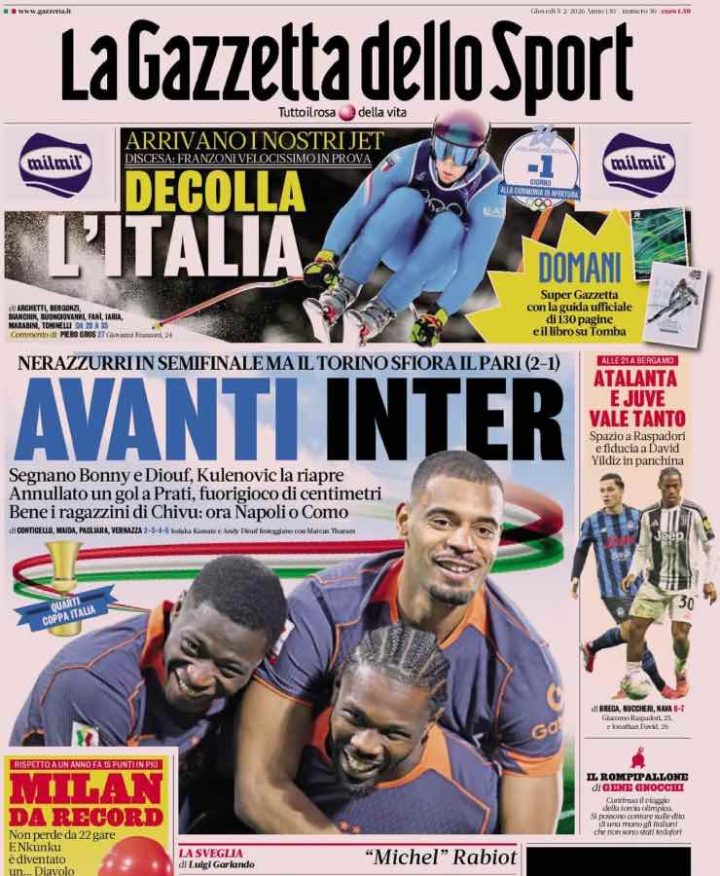 La Gazzetta dello Sport comincia con la vittoria dell’Inter contro il Torino, che vale l’accesso alla semifinale di Coppa Italia. Spazio anche ad Atalanta-Juventus, secondo match dei quarti di finale in programma stasera, 5 febbraio.