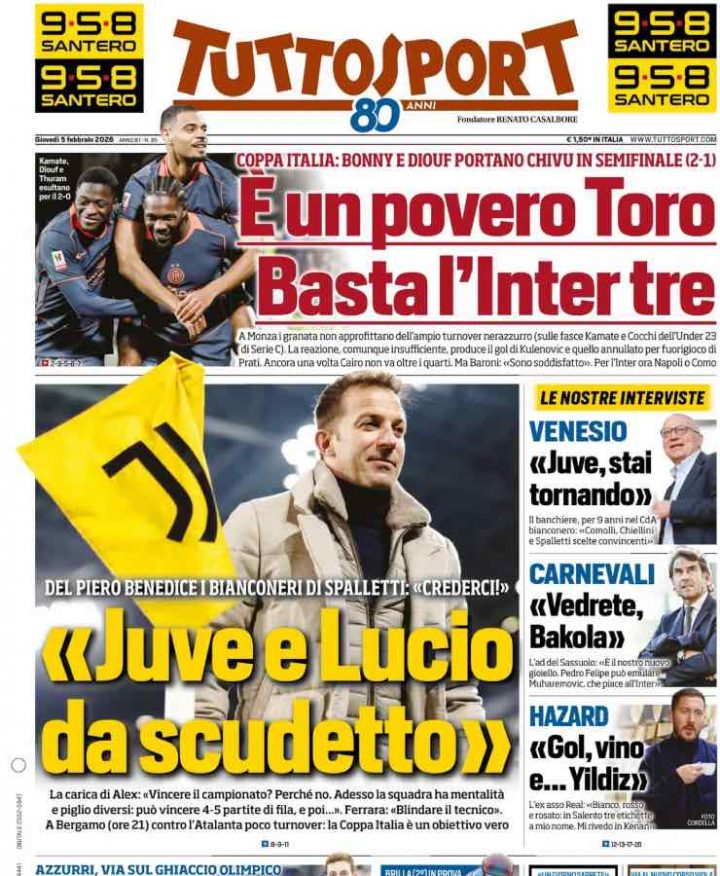 Infine Tuttosport parte dalle parole di Alessandro Del Piero, che ha sottolineato il momento positivo della Juventus sotto la guida di Luciano Spalletti.