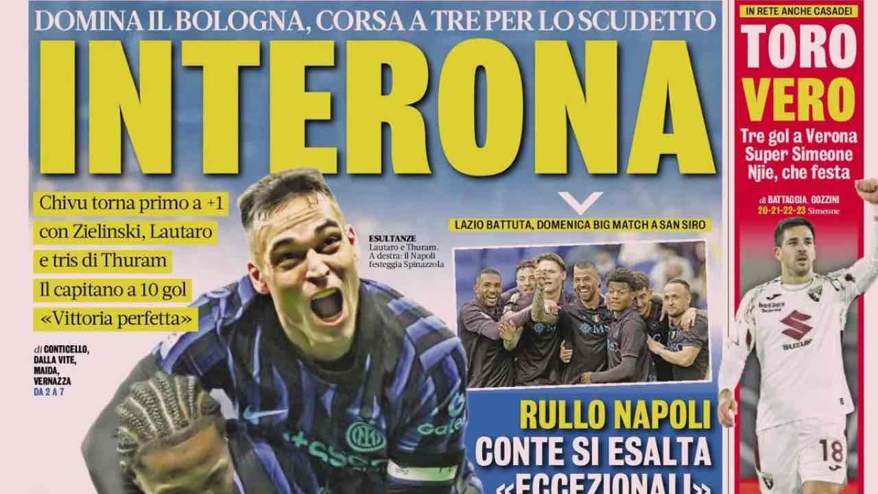 Si chiude la 18ª giornata di Serie A, con la vittoria dell’Inter sul Bologna. La Gazzetta dello Sport titola “Interona”, concentrandosi poi sulla corsa a tre per lo Scudetto. Se il Milan è la big che è cresciuta di più rispetto allo scorso anno, dall’altra continua il rullo Napoli, che si impone 2-0 sulla Lazio all’Olimpico in un match segnato da ben tre espulsioni. In alto, la corsa per il quarto posto tra Juve e Roma, mentre sulla destra il tris del Torino a Verona nel segno del Cholito.