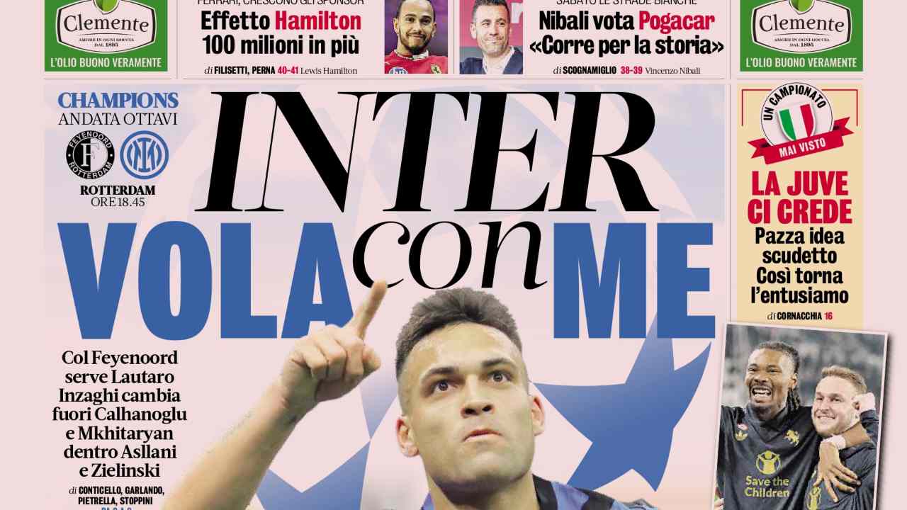 La Gazzetta dello Sport apre con la sfida tra Feyenoord e Inter (alle ore 18.45) valida per l’andata degli ottavi di finale di Champions League.
