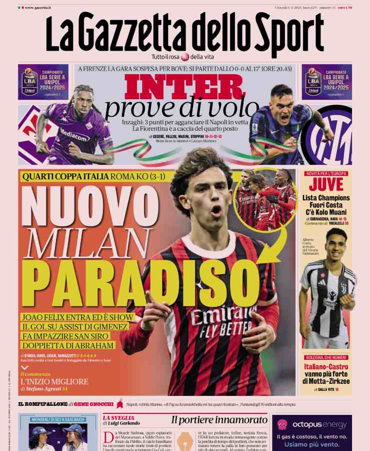 La Gazzetta dello Sport apre con il successo del Milan in Coppa Italia contro la Roma per 3-1: oltre la doppietta dell’ex Abraham, sono subito decisivi anche i nuovi acquisti. Joao Felix, infatti, trova la prima rete in rossonero su assist di Gimenez. Spazio anche al recupero tra Fiorentina e Inter, in programma questa sera (giovedì, 6 febbraio).