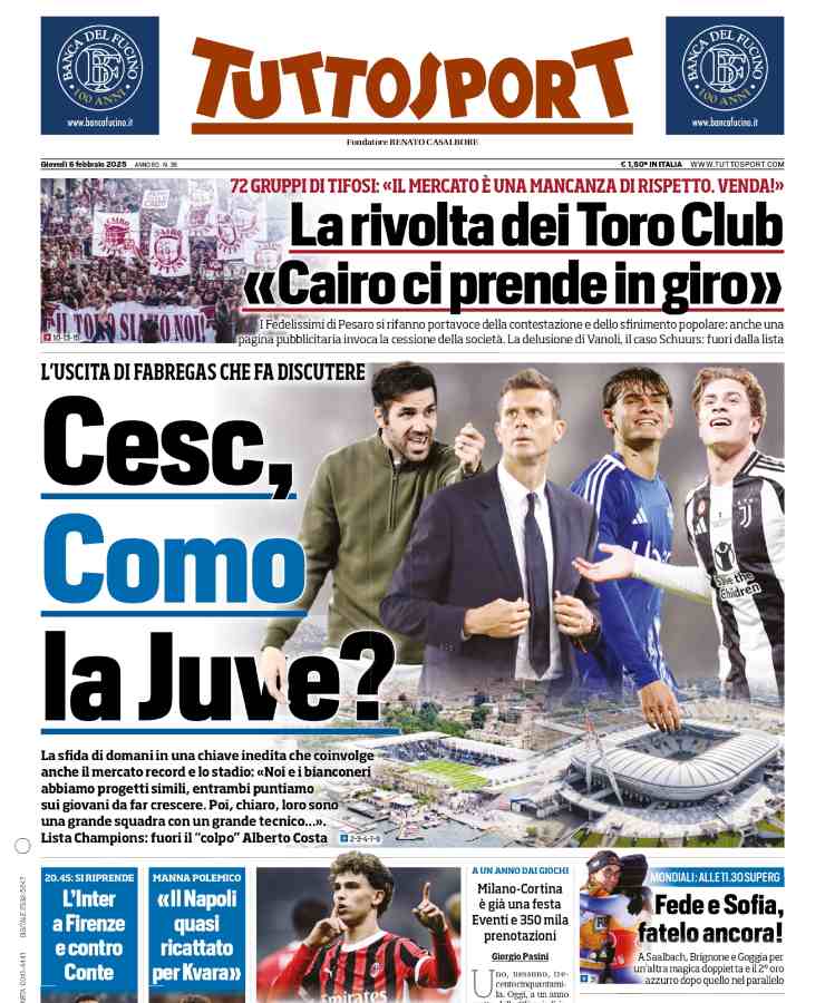 Tuttosport apre con le dichiarazioni di Cesc Fabregas a poche ore dalla gara di Serie A contro la Juventus. Queste, le sue parole: “Noi e i bianconeri abbiamo progetti simili, entrambi puntiamo sui giovani da far crescere. Poi, chiaro, loro sono una grande squadra con un grande tecnico…”.