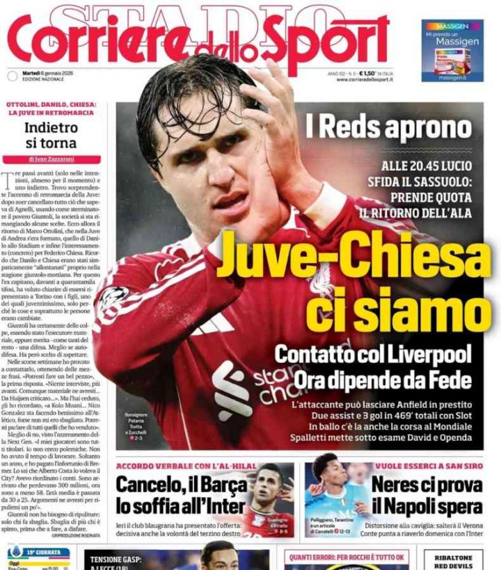 La Gazzetta dello Sport apre ritagliando parecchio spazio al possibile ritorno di Federico Chiesa in bianconero, a distanza di un anno e mezzo dall’addio per trasferirsi al Liverpool.