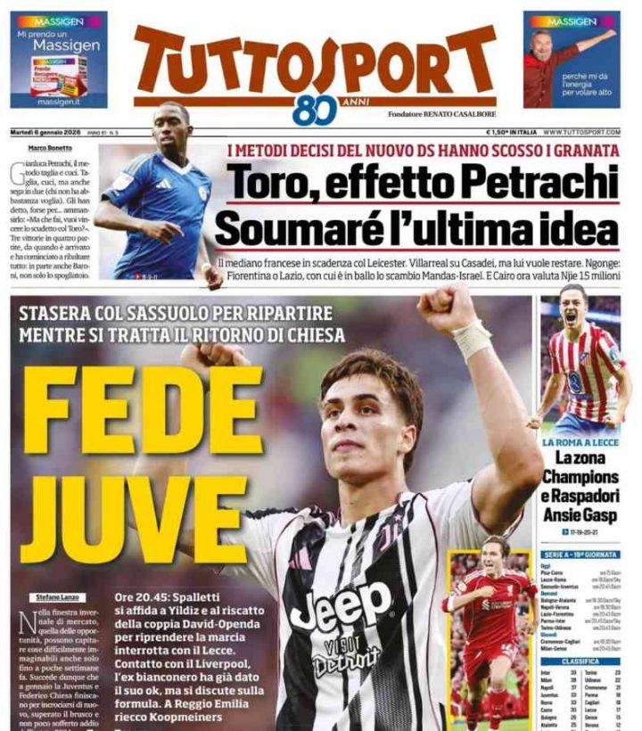 Anche sulla prima pagina di Tuttosport c’è spazio per l’attaccante italiano, mentre la Juventus si prepara per scendere nuovamente in campo per sfidare il Sassuolo nella trasferta di Reggio Emilia.