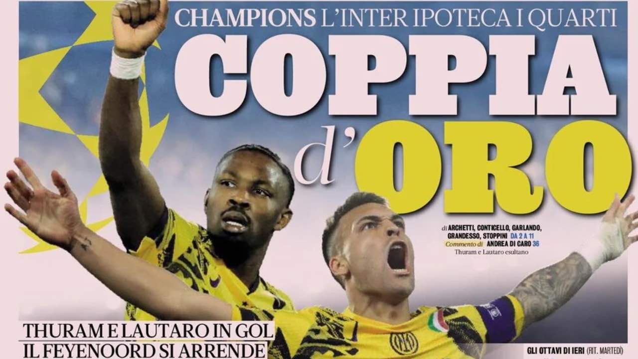 La Gazzetta dello Sport titola “Coppia d’oro” l’edizione odierna del suo giornale, mettendo in luce la grande prestazione offerta dai suoi attaccanti che hanno entrambi segnato nell’andata degli ottavi di finale di UEFA Champions League contro il Feyenoord.