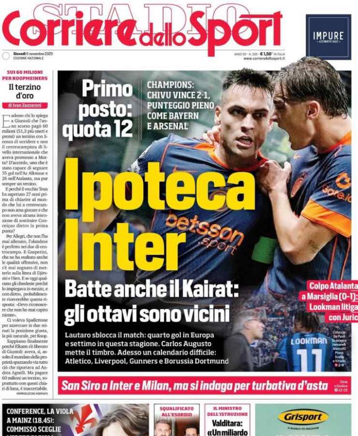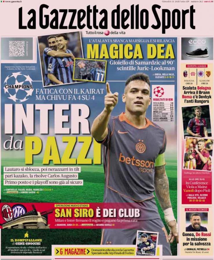 La Gazzetta dello Sport parte dalla vittoria dell’Inter contro il Kairat Almaty, la quarta su quattro in Champions League. In prima pagina anche la firma del rogito per San Siro e al successo dell’Atalanta in casa del Marsiglia.