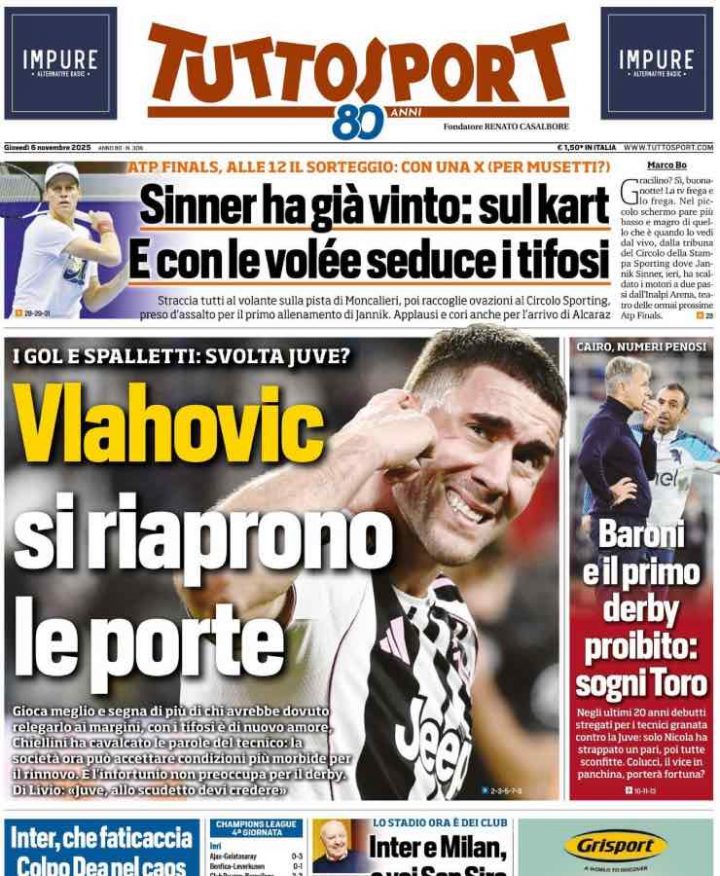Infine Tuttosport parte dal momento di forma di Dusan Vlahovic, che dopo un’estate di incertezza sul mercato sta vivendo un periodo positivo con la Juventus. C’è poi spazio per il primo derby della Mole di Marco Baroni alla guida del Torino, in programma sabato 8 novembre.
