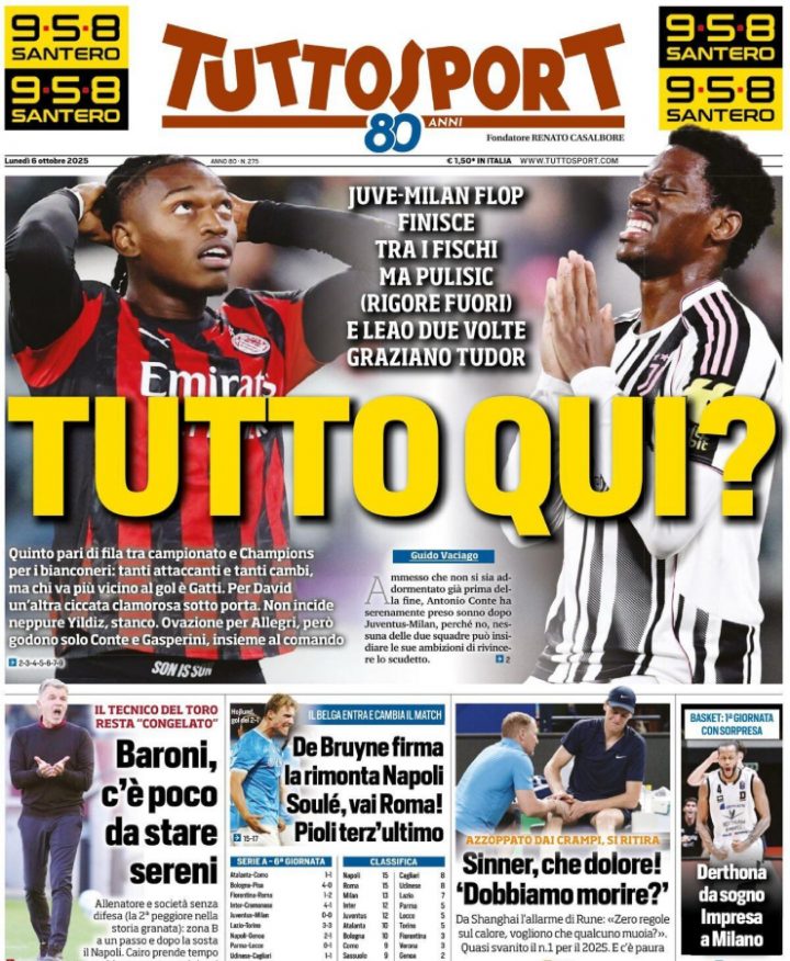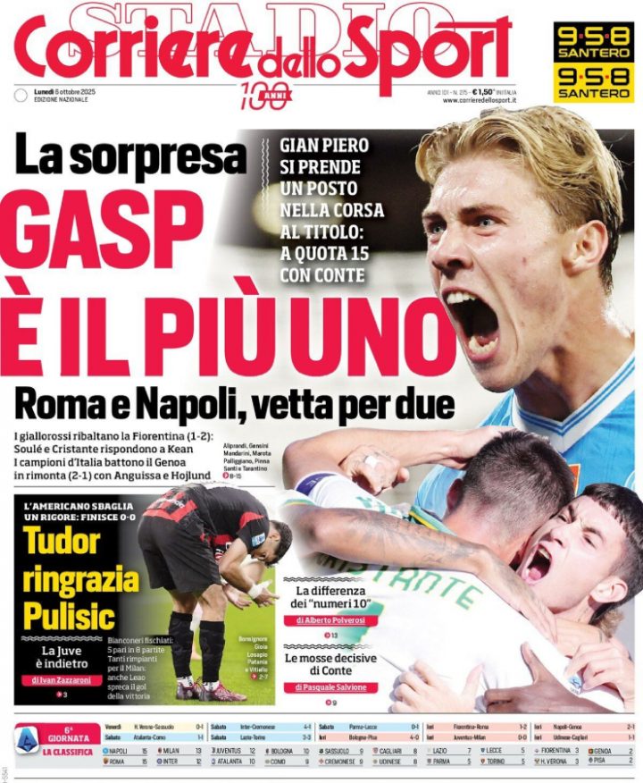 Le prime pagine dei principali quotidiani sportivi in edicola nella giornata di oggi, lunedì 6 ottobre 2025
