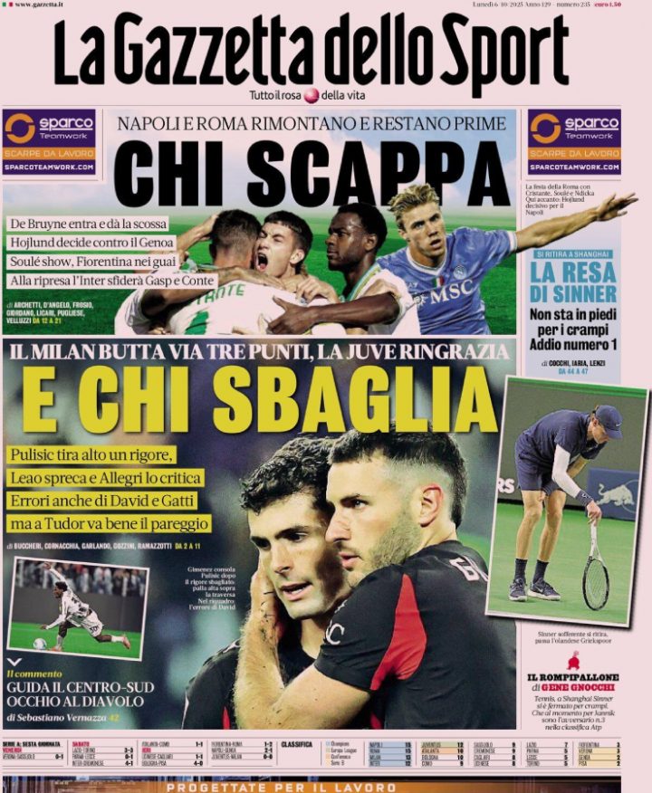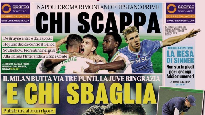 La Gazzetta dello Sport apre con il confronto tra le big, con gli errori di Juventus-Milan e le vittorie di Napoli e Roma.