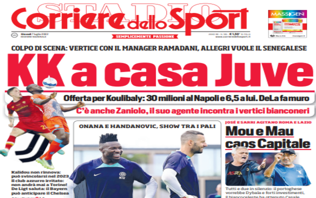 Il calciomercato domina le prime pagine. Dall’incontro dell’agente di Koulibaly con la Juventus all’interesse sempre dei bianconeri per Zaniolo. Questi e molti altri i temi delle prime pagine dei principali quotidiani in edicola giovedì 7 luglio.