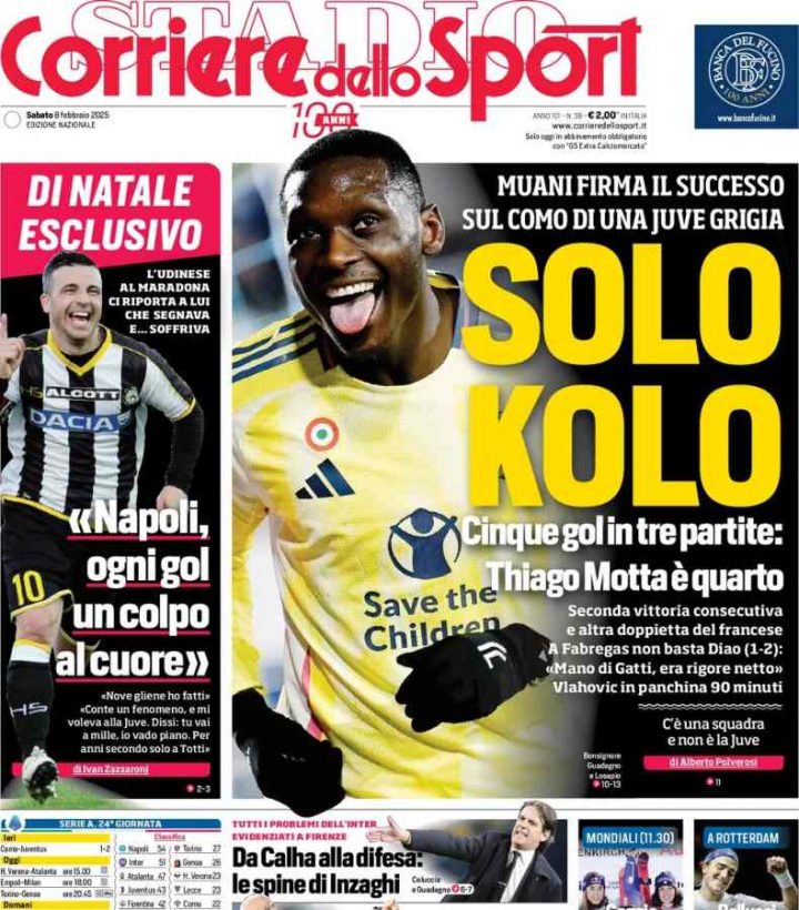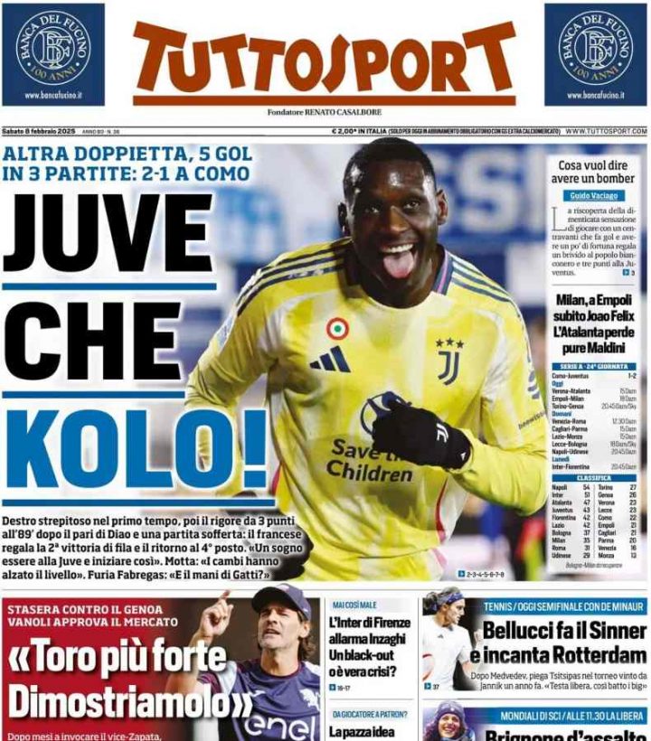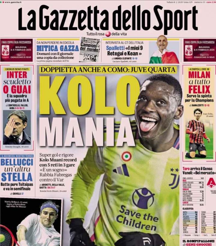 La Gazzetta dello Sport apre con Kolo Muani, grande protagonista della vittoria della Juventus nell’anticipo di Serie A contro il Como per 2-1.