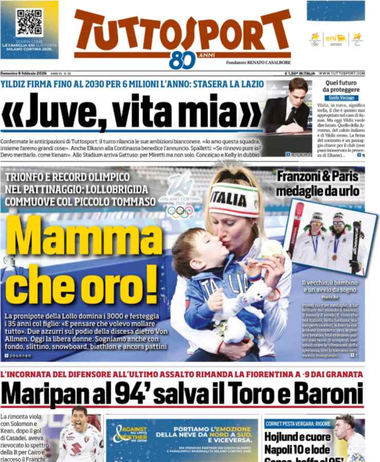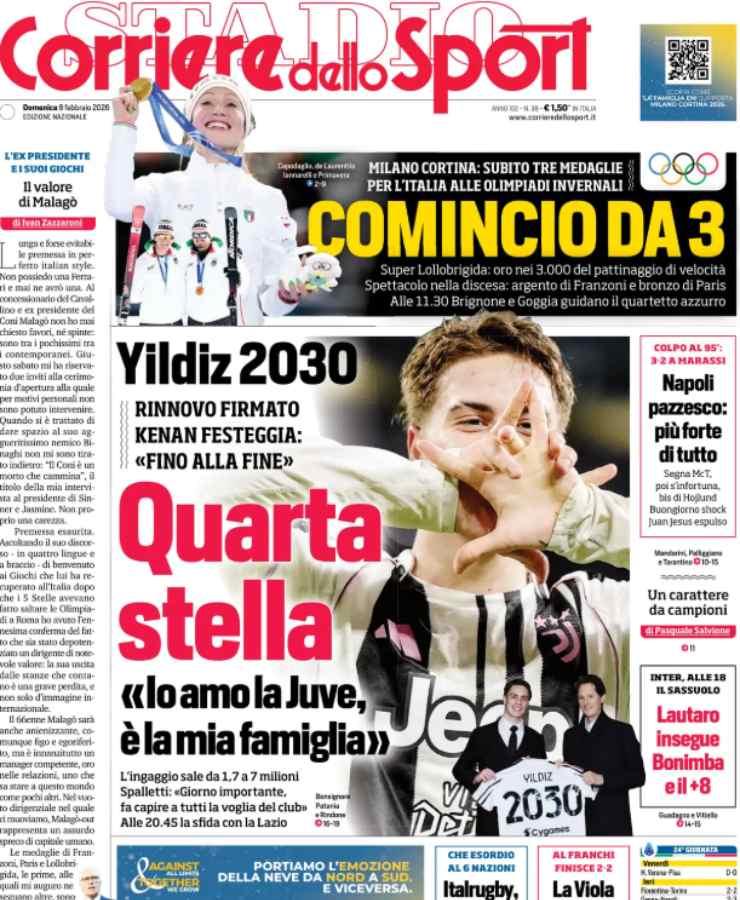 Anche Tuttosport incentra la prima pagina sulle Olimpiadi, ma nella parte superiore si sofferma sul rinnovo di Kenan Yildiz con la Juventus.