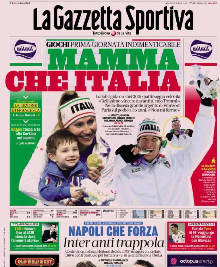 La Gazzetta dello Sport apre esaltando l’oro di Francesca Lollobrigida – il primo dell’Italia alle Olimpiadi invernali di Milano-Cortina. In basso, invece, un focus sul successo in rimonta del Napoli contro il Genoa.