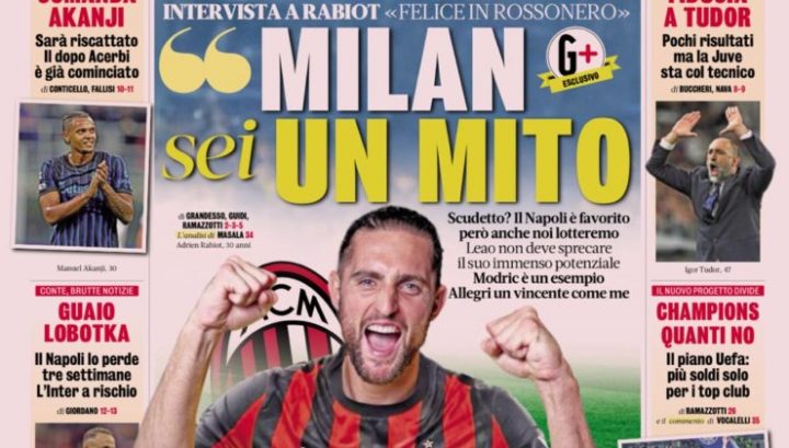 La Gazzetta dello Sport apre con l’intervista ad Adrien Rabiot. Il quotidiano dà spazio in prima pagina anche ai risultati di Tudor sulla panchina della Juve, al riscatto di Akanji in casa Inter e all’infortunio di Lobotka.