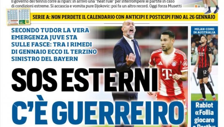 Tuttosport apre con l’emergenza esterni in casa Juventus. Secondo l’allenatore e il giornale, una soluzione potrebbe essere Guerreiro del Bayern Monaco. In prima pagina spazio anche alle parole di Rabiot su Milan-Como in Australia e la clausola di Coco da 35 milioni di euro.