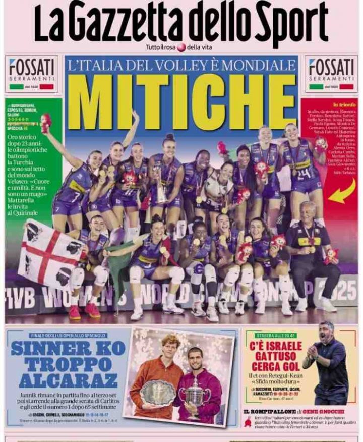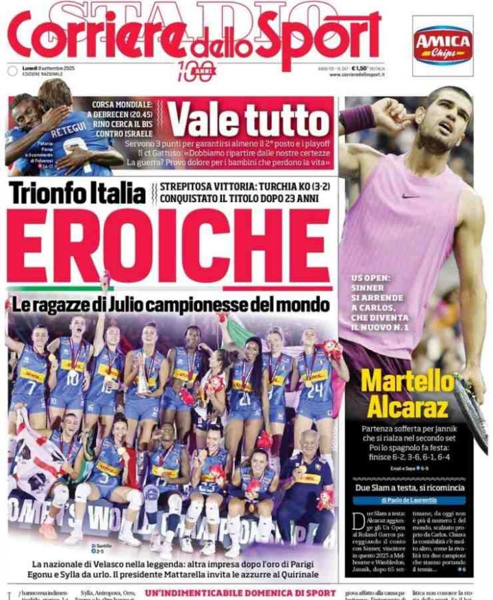 Anche il Corriere dello Sport apre sull’Italia del volley con “Eroiche“: taglio laterale dedicato ad Alcaraz che ha battuto Sinner agli US Open.