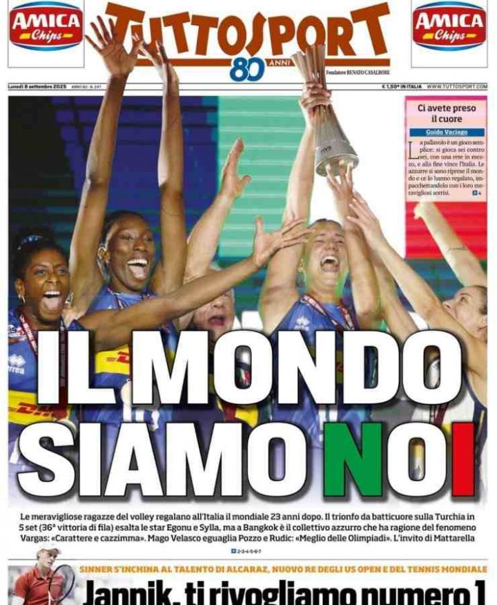 Tuttosport titola in copertina “Il mondo siamo noi”, con le Azzurre che hanno regalato un mondiale all’Italia dopo 23 anni dall’ultima volta.
