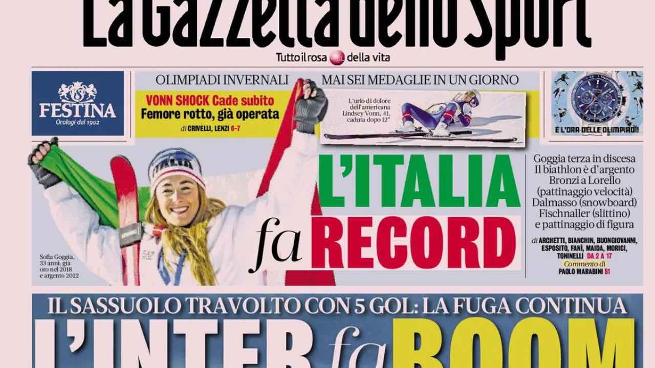 Anche il Corriere dello Sport parte dall’Inter, che allunga a +8 sul Milan in attesa del recupero dei rossoneri contro il Como. Si passa poi alle Olimpiadi invernali, in particolare con la medaglia di bronzo di Sofia Goggia nella discesa libera.